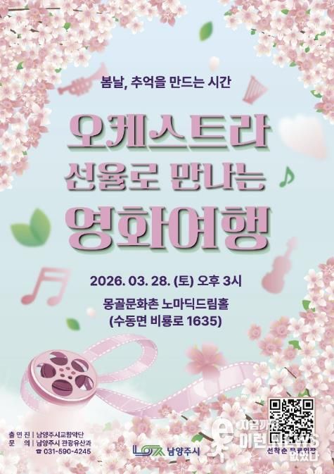이런뉴스(e-runnews) 김삼성 기자 | 남양주시는 오는 3월 28일 오후 3시 수동면 몽골문화촌 노마딕드림홀에서 ‘오케스트라 선율로 만나는 영화여행’공연을 개최한다고 13일 밝혔다.