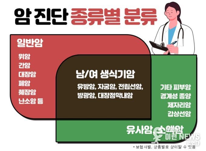 일반적으로 보험사에서 암을 구분할 때에는 일반암, 유사암, 소액암, 고액암 등으로 분류를 하고 있다. 유사암은 보통 경계성종양, 제자리암, 갑상선암, 기타피부암이 해당되고 소액암은 유방암, 방광암, 전립선암, 자궁암이 해당된다. 그리고 고액암은 뼈암이나 뇌암, 췌장암 등이 해당되며 이들을 제외한 나머지 암을 일반암으로 분류한다. 보통 치료비가 많이 드는 고액암이 다른 암보다 진단금이 높은 편이지만, 폭넓은 보장을 위해서는 일반암 진단비를 늘리는 것이 유리하다. 또한, 유사암이나 소액암은 비교적 치료가 간단하고 비용도 적게 들지만 발생빈도가 높은 관계로 보통 일반암 진단비의 10%~20% 정도만 지급되므로 사전에 보장금액을 살펴볼 필요가 있다.