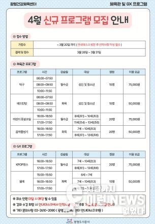 이런뉴스(e-runnews) 김삼성 기자 | 광명도시공사는 광명건강체육센터에서 시민들의 건강 증진과 생활체육 활성화를 위해 체육관 및 GX실 4월 신규 프로그램 회원을 모집한다고 밝혔다.