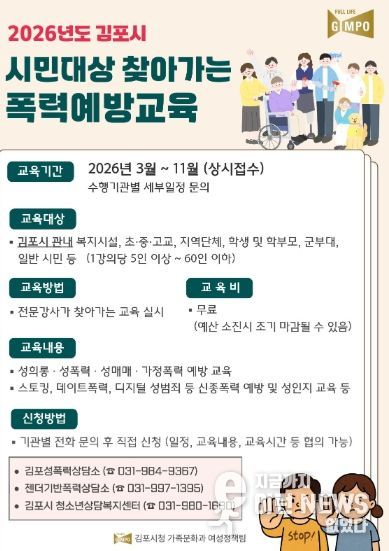 이런뉴스(e-runnews) 김삼성 기자 | 김포시는 시민의 건전한 성 가치관 형성과 폭력 예방 의식 확산을 위해 ‘2026년 김포시 시민대상 폭력예방교육’ 사업을 3월부터 11월까지 추진한다고 밝혔다.