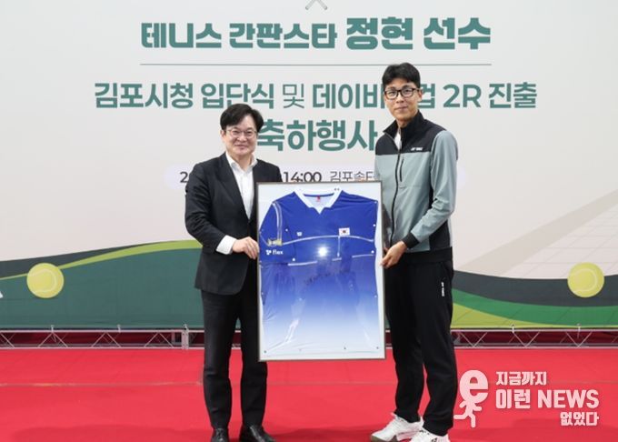 특히 이날 행사에서는 정현 선수가 최근 데이비스컵 경기에서 실제 착용한 유니폼을 기념 액자로 제작해 김병수 시장에게 전달하는 의미 있는 시간이 마련됐다. 해당 유니폼은 국가대표 경기 특성상 소속팀 마크를 부착할 수 없음에도 불구하고, 정현 선수가 김포시청 입단을 기념하고 김포시를 알리기 위해 대한테니스협회에 요청해 특별히 김포시청 마크를 부착하고 출전한 것으로 알려져 의미를 더했다.