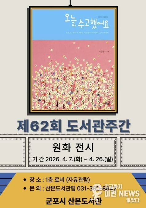 이런뉴스(e-runnews) 김삼성 기자 | 군포시 산본도서관은 도서관주간을 맞아 시민들의 독서문화 확산과 책을 통한 공감의 시간을 마련하기 위해 작가와의 만남, 북토크, 원화전시 등 다양한 프로그램을 운영한다.