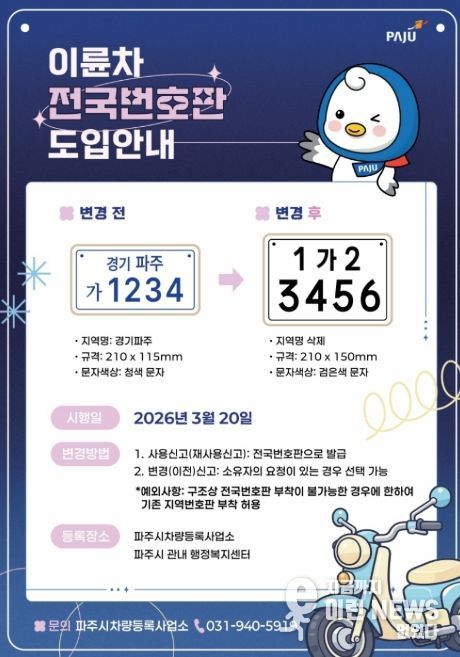 이런뉴스(e-runnews) 김삼성 기자 | 파주시는 오는 20일부터 이륜차 전국번호판 제도를 본격 시행한다.