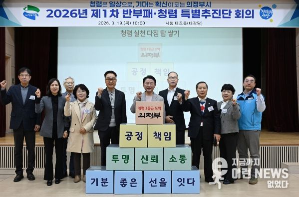 이런뉴스(e-runnews) 김삼성 기자 | 의정부시는 3월 19일 시청 태조홀에서 시장을 비롯해 부시장, 국·소 및 권역국장, 부서장 등 간부 공무원 87명이 참석한 가운데 ‘반부패·청렴 특별추진단 회의’를 열고 ‘기분 좋은 선’ 청렴 실천 공동 선언과 함께 2026년 반부패·청렴도 향상 종합 추진계획을 공유했다.