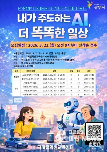 이런뉴스(e-runnews) 김삼성 기자 | 광명시 디지털혁신교육센터가 시민들의 디지털 역량 강화를 위해 오는 23일부터 ‘2026년 상반기 맞춤형 디지털 교육’ 수강생을 선착순 모집한다.