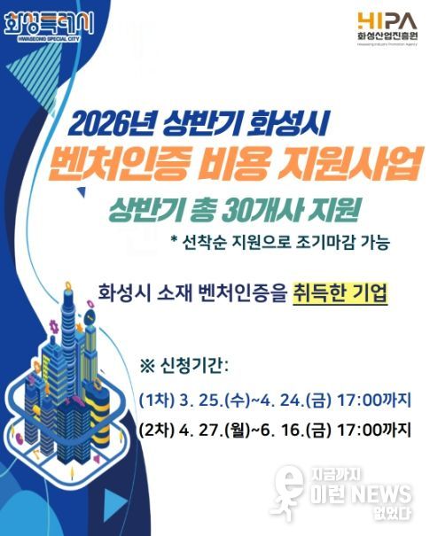 이런뉴스(e-runnews) 김삼성 기자 | 화성산업진흥원(원장 전병선)은 관내 벤처기업 경쟁력 강화를 위해 ‘2026년 상반기 화성시 벤처인증 비용 지원사업’ 참여기업을 오는 4월 24일까지 모집한다고 밝혔다.