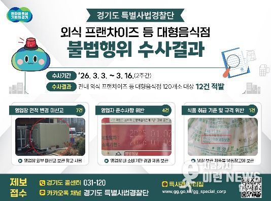 이런뉴스(e-runnews) 김삼성 기자 | 경기도 특별사법경찰단은 지난 3월 3일부터 16일까지 도내 외식 프랜차이즈 등 대형음식점 120개소를 대상으로 집중 수사를 실시한 결과 영업장 면적 변경 미신고 및 영업자 준수사항 위반 등 총 12건의 불법행위를 적발했다.