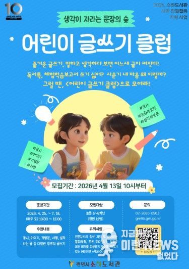이런뉴스(e-runnews) 김삼성 기자 | 광명시 소하도서관은 어린이 글쓰기 클럽 ‘생각이 자라는 문장의 숲’ 수강생을 오는 13일부터 모집한다.