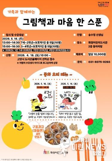 이런뉴스(e-runnews) 김삼성 기자 | 고양특례시 화정어린이도서관은 오는 5월 16일 어린이 동화요리 프로그램 ‘가족과 함께하는-그림책과 마음 한 스푼’을 운영한다.
