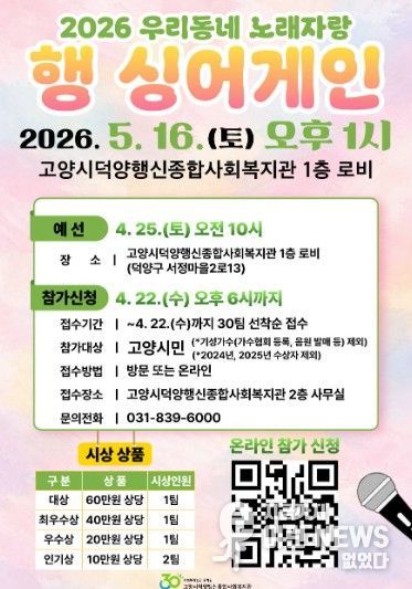 노래자랑은 고양시에 거주하는 시민이라면 누구나 지원이 가능하며 오는 22일까지 온오프라인 중 편한 방법으로 신청하면 된다. 온라인은 관련 링크로 접속해 신청하고 되고, 오프라인은 행신종합사회복지관 2층 사무실에 방문해 신청서류(이름, 주소, 신청곡 등)를 작성·제출하면 된다.