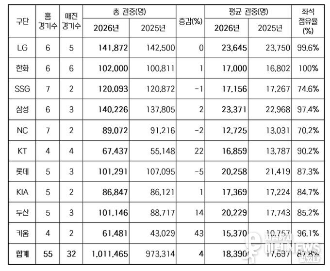이런뉴스(e-runnews) 김삼성 기자 | 2026 신한 SOL KBO 리그가 오늘(10일) 열린 잠실, 고척, 수원, 대전, 대구 경기에 총 9만 1,459명이 입장하며 100만 관중을 달성했다.