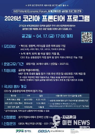 경기도 4차산업혁명센터(C4IR KOREA)는 글로벌 진출 역량을 갖춘 기술 선도 기업을 대상으로 ‘2026년 코리아 프론티어(Korea Frontiers)’ 참가 기업을 오는 17일까지 모집한다고 밝혔다.