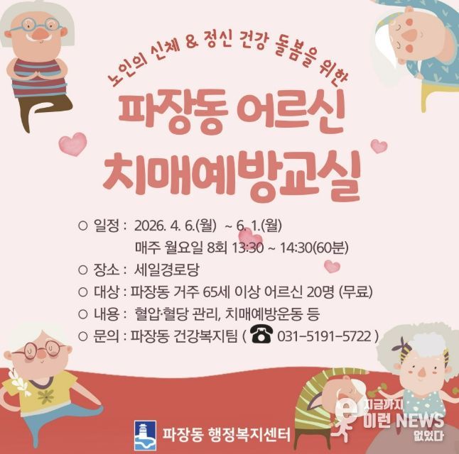 이런뉴스(e-runnews) 김삼성 기자 | 수원시 장안구 파장동은 관내 어르신들의 신체 및 정신건강 돌봄을 위해 ‘2026년 파장동 어르신 치매예방교실’을 장안구보건소 치매안심센터와 협업하여 운영한다고 밝혔다.