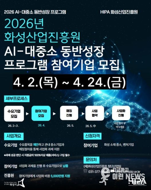이런뉴스(e-runnews) 김삼성 기자 | 화성산업진흥원(원장 전병선)은 대기업과 관내 중소기업 간의 상생협력 지원을 위해 공급가치사슬 전체의 경쟁력 향상을 위해 오는 4월 24일까지 ‘2026년 AI-대중소 동반성장 프로그램’ 참여기업을 모집한다.