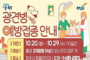 이런뉴스(e-runnews) 김삼성 기자 | 파주시는 반려견을 동반한 야외활동이 잦아지는 가을을 맞아 오는 20일부터 29일까지 생후 3개월 이상의 임신하지 않은 개를 대상으로 광견병 예방접종을 실시한다고 밝혔다. 광견병은 바이러스에 의해 사람과 동물 모두에게 감염될 수 있는 인수공통전염병으로, 잠복기가 상당히 길고 증세가 나타날 경우 치사율이 매우 높기 때문에 사람과 반려동물 모두를 위해 반려견은 매년 1회 반드시 예방접종할 것을 적극 권장하고 있다. 시는 하반기 광견병 예방사업을 위해 예방백신 4,500마리 분을 무상 지원하며, 예방접종을 희망하는 반려견 보호자는 33개 지정 동물병원을 방문해 시술비 1만 원만 부담하면 접종이 가능하다. 참여 동물병원 목록은 파주시청 누리집 공고문을 통해 확인할 수 있다. 동물병원이 없는 읍면지역은 시에서 직접 수의사를 파견해 순회접종을 진행하며, 이 경우 접종비 전액을 시에서 지원할 방침이다. 읍면지역 순회접종 일정은 해당 읍면 행정복지센터 산업팀에 문의하면 된다. 아울러 파주시는 야생동물의 광견병 전파를 막기 위해 광견병 미끼백신을 너구리 등 야생동물이 자주
