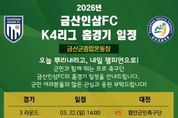 이런뉴스(e-runnews) 김삼성 기자 | 금산인삼에프씨는(FC)는 2026 시즌 케이(K)4리그 안방 사수를 위한 홈경기 일정을 전격 안내에 나섰다. 이번 안내는 군민들이 미리 경기 관람 계획을 세우고 가족·지인과 함께 경기장을 찾을 수 있도록 돕기 위해 마련됐다. 주요 일정 및 상대팀은 △3월 29일 제천시민축구단 △4월 11일 서산에프씨(FC) △5월 2일 기장군민축구단 △5월 31일 거제시민축구단 △6월 21일 진천케이알에프씨(KRFC) △7월 25일 서울중랑축구단 △8월 30일 진주시민축구단 △9월 5일 평택시티즌 △10월 10일 남양주시민축구단 △10월 31일 세종에스에이(SA)축구단 등이다. 홈경기는 군민들의 관람 편의를 위해 주말 오후 시간대에 집중적으로 배치됐다. 구단은 매번 홈경기마다 다채로운 이벤트와 공연, 지역 특산물 홍보 부스 등을 운영해 금산종합운동장을 단순한 경기장을 넘어선 군민 화합과 소통의 광장으로 만들 예정이다. 구단 관계자는 “선수들에게 가장 큰 힘은 관중석을 가득 메운 군민 여러분의 뜨거운 함성”이라며 “확정된 홈경기 일정을 꼭 확인하셔서 경기장을