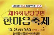 이런뉴스(e-runnews) 김삼성 기자 | ‘제19회 분당구민 한마음 축제’가 오는 10월 25일 오전 9시 30분~오후 1시 중앙공원 야외공연장에서 열린다. 성남시 분당구가 후원하고 분당구민 한마음 축제 추진위원회(위원장 김성민)가 주최해 열리는 이번 행사는 지역사회 화합 분위기를 조성하고자 ‘함께 여는 미래, 함께 만드는 분당’을 주제로 진행된다. 이날 성남시립합창단과 시민 예술단 아인스바움의 공연으로 축제의 화려한 막을 연다. 이어 수내3동, 정자3동, 야탑1동, 백현동 주민자치센터 문화 프로그램에 참여 중인 4개 팀이 난타, 한국무용, 줌바, 에어로빅 등 흥겨운 공연으로 중앙무대를 꾸민다. 초청 가수 김용필(미스터트롯2 출신)의 ‘오히려 좋아’, ‘낭만의 계절’, 바이올리니스트 백진주와 소프라노 유경진이 듀엣으로 연주하는 영화음악(OST) ‘캐리비안의 해적’, ‘대부’, 성남청년프로예술단의 댄스 공연도 열려 축제 분위기를 달군다. 중앙공원 황새울광장에는 배틀 로봇, 4족 보행 로봇 등 6개의 4차산업 체험존, 시민 체험용 드론 축구존, 추억의 사진관을 차려 운영한다. 장애인 복