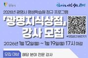 이런뉴스(e-runnews) 김삼성 기자 | 광명시 평생학습원이 시민 맞춤형 평생학습 프로그램 ‘광명지식상점’을 운영할 2026년도 전문 교육 강사를 공개 모집한다. ‘광명지식상점’은 시민의 삶과 밀접한 주제를 중심으로 배움과 성장을 지원하는 광명시 대표 평생학습 프로그램이다. 2026년에는 ▲미래기술 ▲직무역량 ▲재무설계 ▲인문성찰 ▲관계학습 ▲시민학습 ▲기타 제안과정 등 7개 분야에서 강사를 선발해 시민들에게 다채로운 교육 서비스를 제공할 예정이다. 지원 자격은 해당 모집 분야의 전문성을 보유하고 관련 자격증과 실무경력을 모두 갖춘 자에 한한다. 시는 강의 경력, 강의계획서, 자기소개서 등을 바탕으로 1차 서류심사를 진행한 뒤, 수업 시연과 질의응답으로 구성된 2차 면접심사를 거쳐 최종 40여 명의 강사를 선발할 계획이다. 접수는 오는 12일부터 19일 17시까지 이메일 또는 평생학습원 2층 사무실 방문을 통해 가능하다. 제출 서류 등 세부 사항은 광명시 평생학습플랫폼 ‘광명이(e)지’ 공지사항에서 확인할 수 있다. 최종 합격자는 2월 중 ‘광명e지’에서 발표하며, 선발된 강사진은