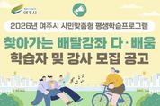이런뉴스(e-runnews) 김삼성 기자 | 여주시는 시민 누구나 원하는 시간과 장소에서 배움을 이어갈 수 있도록 지원하는 2026년 시민 맞춤형 평생학습 프로그램 ‘찾아가는 배달강좌’의 학습자와 강사를 모집한다고 밝혔다. ‘찾아가는 배달강좌’는 여주시민 또는 관내 사업체 근로자 7명 이상이 학습모임을 구성해 강좌를 신청하면, 전문 강사가 직접 찾아가 강의를 진행하는 학습자 중심의 평생학습 프로그램으로 이 사업은 평생학습 접근성을 높이고, 학습 사각지대 해소와 공동체 기반 학습문화 확산에 기여하고 있다. 학습자 ‘다·배움’모집은 2026년 2월과 5월(각 1~10일) 진행되며, 선정된 학습모임은 강좌당 최대 20시간 이내에서 무료로 교육을 받을 수 있으며, 강사 ‘다·선생’모집은 1월과 4월(각 20~25일) 두 차례 진행되며, 선정된 강사는 학습모임과 매칭돼 강의를 진행한다. 특히, 2026년부터는 기존 일반강좌 외에도 정책 연계형 특화강좌가 새롭게 운영되어 ▲경력단절 여성의 사회 재도약 ▲생활밀착형 생성형 AI 활용 교육 ▲농업·생태·전통문화 융합형 미래인재 양성 등 시민의 생애주기와 지역 특성을 반영한 맞