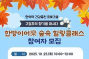 이런뉴스(e-runnews) 김삼성 기자 | 파주보건소는 시민들의 건강한 삶을 위한 한의약 건강 증진 프로그램인 ‘한방이어락(樂) 숲속 치유교실(힐링 클래스)’을 오는 25일 10시부터 12시까지 율곡수목원에서 운영한다. 이번 프로그램은 자연 속에서 가족이 함께 건강을 되돌아보고, 숲에서의 명상과 호흡을 통해 스트레스를 해소하고자 기획됐다. 참가자들은 수목원의 맑은 공기와 아름다운 풍경 속에서 지친 몸과 마음을 회복하는 시간을 갖게 된다. 주요 내용은 ▲구절초 숲길 산책 ▲자연 속에서 가족과 추억 만들기 ▲구절초 차 마시기 등 구절초를 주제로 한 다양한 활동으로 구성되어 있다. 신청은 파주시 평생교육포털 누리집(lll.paju.go.kr)을 통해 가능하며, 가족 단위로(4~6가구, 총 20여 명) 선착순 모집한다. 단, 신청 가구가 많을 경우 3대 가족을 우선 선발한다. 이한상 파주보건소장은 “자연과 함께하는 치유 프로그램을 통해 가족 간 유대감을 높이고, 건강한 생활 습관을 기를 수 있는 계기가 되길 바란다”라며 “많은 시민들의 적극적인 참여를 기대한다”라고 밝혔다.