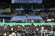 이런뉴스(e-runnews) 김삼성 기자 | 이동환 고양특례시장이 지난 29일 고양체육관에서 열린 ‘2025년 경기도지사기 줄넘기대회’에서 축사를 하고 참가 선수들의 활약을 응원했다. 이날 1,500여 명이 참가해 30초 번갈아 뛰기, 3분 뛰기, 프리스타일, 단체전 등 부문에서 실력을 겨뤘다.
