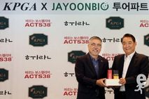 이런뉴스(e-runnews) 김삼성 기자 | ㈜한국프로골프투어(대표이사 김원섭, KPGT)와 ㈜자윤바이오(대표이사 윤성운)가 KPGA 투어파트너 협약을 체결했다. 4월 2일(목) 경기 성남에 위치한 KPGA 빌딩에서 진행된 조인식에는 김원섭 KPGT 대표이사, 윤성운 자윤바이오 대표이사, 황선일 자윤바이오 총괄본부장 등 여러 관계자들이 참석해 상호 신뢰를 바탕으로 한 협력을 약속했다. 이번 협약을 통해 자윤바이오는 2026시즌 투어 선수들의 에너지 회복과 컨디션 관리를 위한 ‘액츠38’과 자외선으로부터 피부를 보호할 수 있도록 ‘휘란’을 제공한다. 또 ‘액츠38’과 ‘휘란’은 각각 KPGA 공식 리커버리크림, KPGA 공식 선크림으로 지정됐다. 윤성운 자윤바이오 대표이사는 “이번 기회를 통해 KPGA 투어 선수들에게 ‘액츠38’과 ‘휘란’을 제공하게 되어 기쁘다”며 “장시간 야외에서 대회를 치러야 하는 선수들에게 자윤바이오의 과학적 제품들이 실질적인 도움이 되기를 바란다”고 말했다. 김원섭 KPGT 대표이사는 “이번 협약을 통해 자윤바이오와 인연을 맺게 돼 기쁘다. KPGT를 위해 아낌없는 지원을