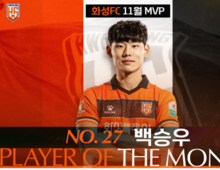 이런뉴스(e-runnews) 김삼성 기자 | 화성FC의 핵심 미드필더 백승우가 팬 투표를 통해 2025시즌 11월 월간 MVP로 선정됐다. 이번 팬 투표는 11월 26일(수)부터 11월 27일(목)까지 이틀간 구단 공식 SNS를 통해 진행됐으며, 전체 투표자의 72%를 얻은 백승우는 압도적인 득표율로 11월의 주인공이 됐다. 백승우는 올 시즌 왕성한 활동량과 날카로운 침투를 바탕으로 팀 공격의 연결고리 역할을 맡아왔다. 화성FC의 프로 첫 홈경기였던 충남아산전에서 데뷔골을 터뜨린 데 이어, 곧바로 이어진 경남과의 경기에서도 연속 득점을 기록하며 팀의 핵심 자원으로 자리매김했다. 특히 11월 김포전에서는 팀이 뒤지고 있는 상황에서도 득점을 만들어내며 끝까지 포기하지 않는 끈기와 집념을 보여줬다. 백승우는 “올 시즌 마지막 달인 11월 MVP로 선정돼 영광이고, 덕분에 한 해를 행복하게 마무리할 수 있을 것 같다. 한 시즌 내내 아낌없는 응원을 보내주신 팬분들께 진심으로 감사드리며, 내년에도 많은 사랑과 응원 부탁드린다.”고 소감을 전했다.
