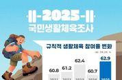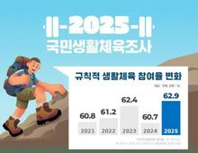 이런뉴스(e-runnews) 김삼성 기자 | 문화체육관광부는 만 10세 이상인 국민 9천 명을 대상으로 시행한 ‘2025년 국민생활체육조사’ 결과를 발표했다. 2025년 생활체육 참여율(주 1회, 30분 이상)은 62.9%로, 전년 대비 2.2%포인트(p) 상승했다. 특히 주 2회 이상 참여율은 52.2%로 2.7%포인트(p) 증가했다. 연령대별로는 20대부터 60대까지의 참여율은 65% 내외로 비교적 고르게 나타났으나, 10대(43.2%)와 70대 이상(59.5%)은 다른 연령대에 비해 낮은 수준을 보였다. 주요 참여 종목은 걷기(40.5%), 보디빌딩(17.5%), 등산(17.1%) 순으로 나타났다. 이 중 등산은 전년 대비 5.0%포인트(p) 증가해 참여 비중의 증가 폭이 가장 컸다. 주로 참여하는 체육활동(1+2+3순위) 1회 평균 참여 시간은 ‘1시간~1시간 30분 미만’이라고 응답한 비율이 67.3%로 가장 높았다. 최근 1년간 체육활동 참여 기간이 ‘9개월 이상’이라고 응답한 비율은 91.4%였다. 규칙적 참여자의 평균 참여 기간은 14개월로, 전년(11개월) 대비 증가한 것으로 나타났다. &nbs