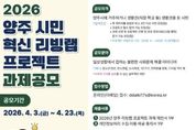 이런뉴스(e-runnews) 김삼성 기자 | 양주시가 시민이 일상에서 겪는 사회문제를 직접 발굴하고 해결 방안을 모색하는 ‘2026년 양주 시민 혁신 리빙랩 프로젝트’ 공모를 오는 23일까지 진행한다. 이번 공모는 시민 참여를 기반으로 지역사회 문제 해결 방안을 도출하기 위해 마련됐다. 양주시에 거주하거나 직장·학교 등 생활권을 둔 시민이면 누구나 참여할 수 있다. 참여는 주제안자를 포함한 4인 이상으로 구성된 팀 단위로 가능하며, 공감토크(현장심사)와 과제 선정 이후 진행되는 워크숍, 성과공유회(12월 예정) 등에 참여해야 한다. 공모 주제는 청소년·청년, 탄소중립, 도시재생, 1인 가구, 반려동물 문화, 디지털 격차 등 지역사회가 직면한 다양한 사회문제 해결과 관련된 아이디어다. 접수된 제안은 사회적 가치와 효과성·창의성, 실현 가능성 등을 기준으로 제안심사실무위원회 심사와 공감토크 현장심사를 거쳐 최종 과제로 선정된다. 최종 선정된 2개 팀은 5월부터 11월까지 약 7개월간 퍼실리테이터(활동촉진자)와 함께 워크숍에 참여하며, 문제 정의부터 개선 방향 도출, 시범사업 추진까지 단계별