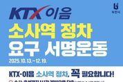 이런뉴스(e-runnews) 김삼성 기자 | 부천시는 서해선 KTX-이음 열차의 소사역 정차를 추진하기 위해 10만 서명운동을 시작했다. 이번 서명운동은 12월 19일까지 진행되며, 관내 시민과 인천·서울 서남권 주민의 광역철도 접근성을 높이고, 지역 산업과 관광 활성화를 통한 경제적 효과를 목표로 추진된다. 온라인 서명운동은 큐알(QR)코드와 부천시 홈페이지를 통해 참여할 수 있다. 오프라인 서명운동은 시청과 원미구·소사구·오정구청, 각 동 행정복지센터 민원실을 비롯해 소사역, 부천시청역 등 주요 전철역과 아파트 단지 등 시민 접근이 쉬운 장소에서 진행된다. 이와 함께 시는 이번 서명운동에 시민과 지역 단체, 학교 등 다양한 주체가 참여할 수 있도록 적극적인 홍보활동도 병행할 계획이다. 특히‘서해선 KTX-이음 소사역 정차’의 필요성과 지역 발전 효과를 널리 알리기 위해 소셜네트워크서비스(SNS), 지역 축제 현장 캠페인 등을 통해 적극적으로 홍보할 예정이다. 조용익 부천시장은 “KTX-이음 소사역 정차는 단순한 교통 개선을 넘어, 서해선 시대에 부천이 수도권 서남부의 중심으로 도약할 수 있는 계