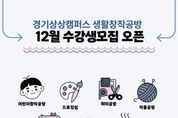 이런뉴스(e-runnews) 김삼성 기자 | 경기문화재단 경기상상캠퍼스(대표이사 유정주)는 겨울 시즌 생활창작공방 프로그램 참여자를 오는 17일부터 모집한다. 생활창작공방은 경기상상캠퍼스 생생1990에 위치한 경기생활문화센터 교육 커뮤니티 공간으로, 도민이 일상 속에서 다양한 창작 활동을 경험할 수 있도록 재단공방, 어린이창작공방, 드로잉실, 취미공방, 직물공방, 커피공방, 사진촬영실까지 총 7개의 특화 공간을 운영하고 있다. 11월에는 총 11개의 프로그램이 구성돼 있으며, 주요 프로그램으로는 △Set in wool(울조끼와 가방 만들기), △오롯이 나에게 집중하는 시간: 4주 터프팅 힐링 프로젝트, △내 생애 첫 그림- 알기 쉬운 민화'일월오봉도', △그림책 마음 놀이터 등이 있다. 12월에는 △오일파스텔로 만드는 2026년 달력 △우리들의 예술놀이터, △복을 담는 라탄 복조리 만들기, △복을 쓸어 담는 모시 빗자루 만들기, △커피의 감별과 추출 방법: 커핑까지 총 5개의 프로그램이 운영될 예정이며, 수강 신청은 11월 14일부터 각 프로그램 시작 4일 전까지 경기상상캠퍼스 누리집을 통해 가능하다. &nbs