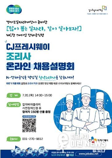 이런뉴스(e-runnews) 김삼성 기자 | 경기도일자리재단(대표이사 채이배)이 ‘많이 뽑는 일자리, 같이 알아보자!’ 프로젝트의 일환으로 CJ프레시웨이와 함께 대기업 단체급식 부문 채용설명회를 연다.