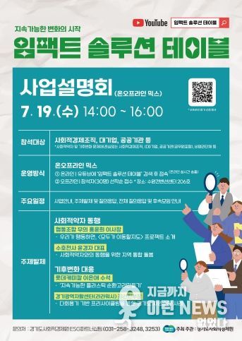 이런뉴스(e-runnews) 김삼성 기자 | 경기도사회적경제원이 대기업, 공공기관, 사회적기업, 협동조합 등 다양한 이해관계자가 공동으로 참여해 문제를 정의하고 해결방안을 함께 도출해 가는 ‘임팩트 솔루션 테이블’을 개최한다.