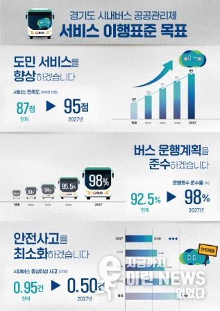 공공관리제 시행에 맞춰 안전하고 편리한 버스 서비스 제공을 위해 서비스 이행표준 목표를 수립했다. 구체적으로 ▲서비스 만족도는 현재 87점에서 2027년 95점 이상 개선 ▲버스 운행 횟수 준수율은 현재 92.5%에서 2027년 98% 이상 향상 ▲시내버스 중상 이상 사고 건수를 현재 1일당 0.95건에서 2027년 0.50건 이하로 목표를 설정했다.