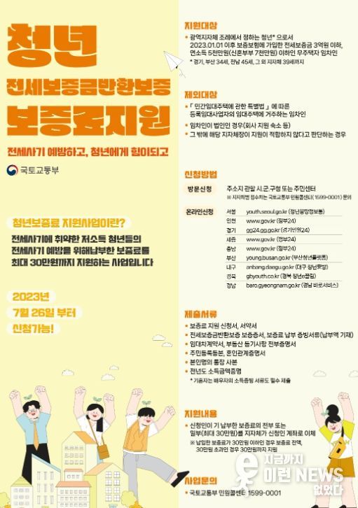 국토교통부의 ‘청년 전세보증금 반환보증 보증료 지원’은 청년들이 전세사기를 예방하기 위해 납부한 보증료를 최대 30만 원까지 지원하는 사업이다. 최근 전세사기, 역전세 현상 등으로 임대차 계약 종료 후에도 보증금을 돌려받지 못하는 피해사례가 증가하자 청년층의 전세보증금 반환보증 가입을 유도하기 위해 보증료를 지원하는 것이다.