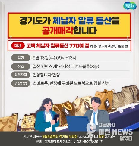 이런뉴스(e-runnews) 김삼성 기자 | 경기도가 지방세 고액 체납자 가택수색을 통해 압류한 명품 시계, 가방 등 770여 점을 9월 13일 공개 매각한다.