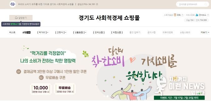 이런뉴스(e-runnews) 김삼성 기자 | 경기도와 경기도주식회사가 경기도 사회적경제 기업제품 판매 촉진을 위해 오는 28일부터 9월 15일까지 ‘경기도 사회적경제 쇼핑몰에서 3만 원 이상 구매할 때 네이버 포인트 5천 원을 지급하는 이벤트를 한다.