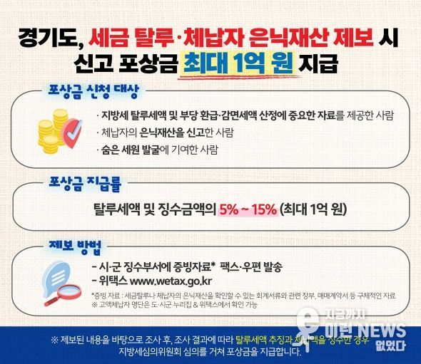 이런뉴스(e-runnews) 김삼성 기자 | 경기도가 탈세 신고포상금을 최대 1억 원까지 지급하는 ‘지방세 탈루 세액·체납자 은닉재산 민간인 신고포상제’를 시행하고 있다며 도민들의 관심과 제보를 요청했다.