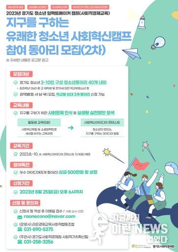 이런뉴스(e-runnews) 김삼성 기자 | 경기도와 경기도사회적경제원이 8월 25일 오후 6시까지 사회혁신 사고와 창의성을 발휘하는 청소년 인재 양성을 위한 사회적경제 교육과정 ‘지구를 구하는 유쾌한 사회혁신캠프’에 참여할 청소년동아리를 모집한다.
