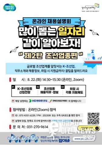 이런뉴스(e-runnews) 김삼성 기자 | 경기도일자리재단이 ‘많이 뽑는 일자리, 같이 알아보자!’ 프로젝트 2탄으로 조선업종 부문 온라인 채용설명회를 연다.