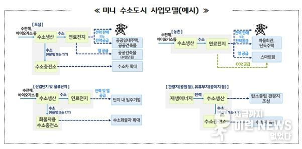 도가 새롭게 추진하는 ‘미니 수소도시 조성사업’은 경기도 민선8기 공약사항인 ‘수소융합 클러스터 조성’에 따른 것이다. 예를 들어, 미니 수소도시 내에서 수소를 생산하고 수소충전소나 연료전지를 통해 공공건축물에 전력을 공급하고 수소차를 확대하는 모델을 제시할 수 있다.