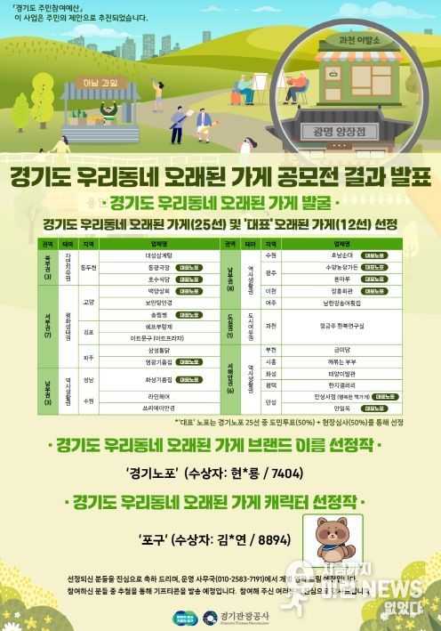 해당 공모전과 함께 치러진 ‘경기도 우리동네 오래된 가게 대표 이름 짓기(브랜드 공모전)’에서는 최종적으로 ‘경기노포’가 선정됐고, ‘경기도 우리동네 오래된 가게 대표 캐릭터’에는 동네 곳곳 숨어있는 노포를 찾아다니는 너구리 캐릭터인 ‘포구’가 선정됐다.