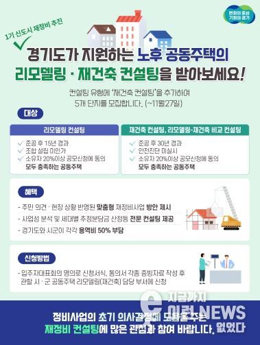 이런뉴스(e-runnews) 김삼성 기자 | 경기도가 올해 하반기 ‘공동주택 재정비 컨설팅 사업’ 기존 유형인 리모델링, 리모델링-재건축 비교에 재건축을 추가해 5개 단지를 지원한다.