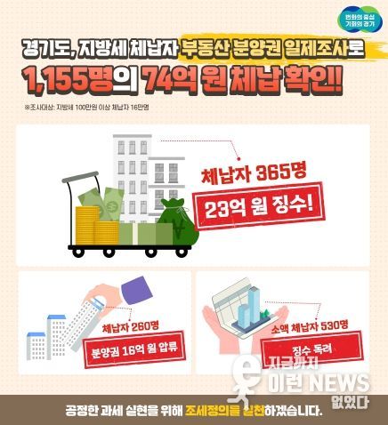 이런뉴스(e-runnews) 김삼성 기자 | 경기도가 지방세 100만 원 이상 체납자 16만 명을 대상으로 전국 부동산 분양내역을 일제조사해 분양권을 보유한 체납자 365명으로부터 체납세금 23억 원을 징수했다.