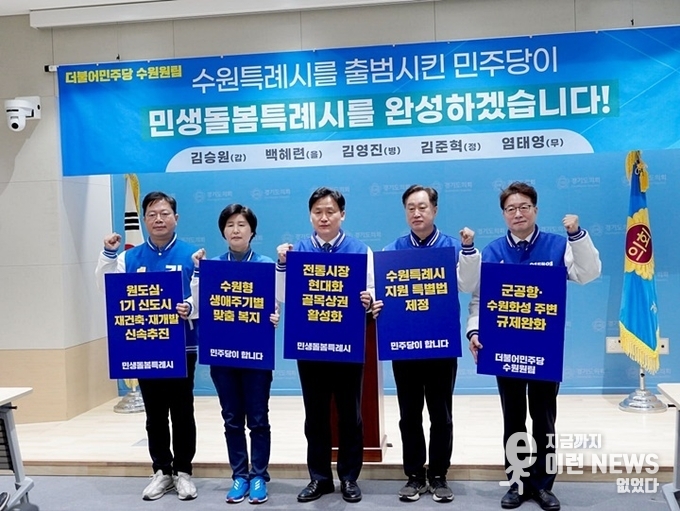 이런뉴스(e-runnews) 김삼성 기자 | 수원시 지역 더불어민주당 소속 김승원(갑), 백혜련(을), 김영진(병), 김준혁(정), 염태영(무) 후보는 19일(화) 오전 수원시의회에서 공동기자회견을 열고 “수원특례시 정치와 행정의 품격을 높여 ‘민생돌봄 특례시’를 완성하겠다”고 밝혔다.