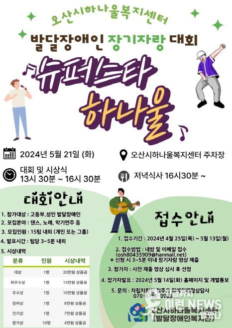 이런뉴스(e-runnews) 김삼성 기자 | 오산시하나울복지센터는 오는 21일 발달장애인의 끼를 발산할 수 있는 제1회 발달장애인 장기자랑 대회 ‘슈퍼스타 하나울’을 개최한다고 밝혔다.
