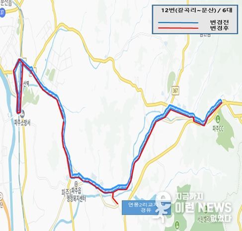 12번 버스는 법원읍 갈곡리에서 파주읍을 거쳐 문산읍까지 운행하는 시내버스로, 이번에 연풍2리 교차로까지 노선이 연장된다.