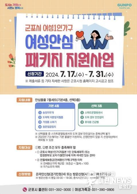 이런뉴스(e-runnews) 김삼성 기자 | 군포시는 범죄 대응능력이 취약한 여성 1인가구의 안전한 일상을 위하여 ‘여성 1인가구 여성안심 패키지 지원사업’을 지난해에 이어서 올해도 신청자를 모집한다고 밝혔다.
