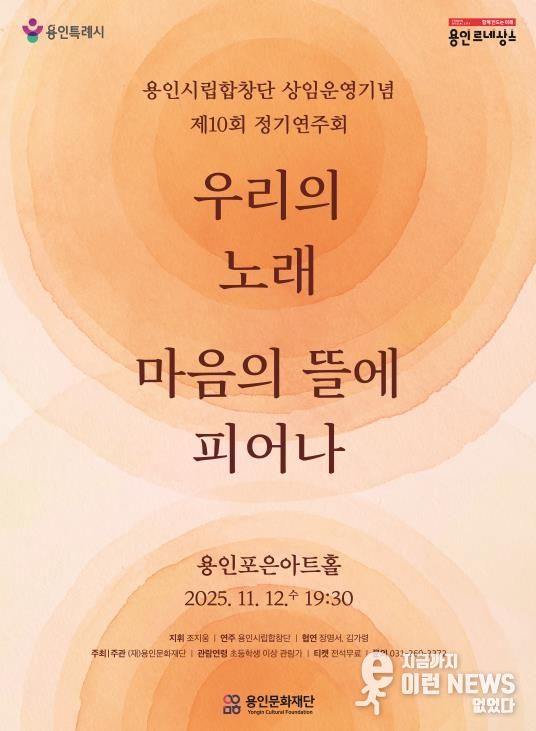 이런뉴스(e-runnews) 김삼성 기자 | (재)용인문화재단은 오는 11월 12일 오후 7시 30분, 용인포은아트홀에서 용인시립합창단 상임 운영기념 ‘제10회 정기연주회’'우리의 노래, 마음의 뜰에 피어나'를 개최한다.