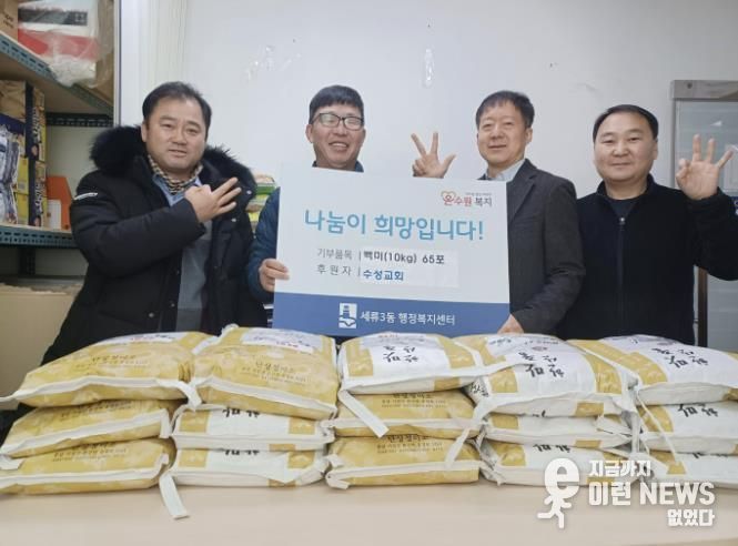 세류3동 행정복지센터는 지난 22일 수성교회가 관내 취약 계층에게 전달해달라며 백미(10kg) 65포를 기탁했다고 밝혔다. 수성교회는 매년 지역 내 어려운 이웃들을 위해 정기적으로 후원 물품을 전달하며 나눔 문화 확산과 지역 복지 증진에 앞장서 오고 있다.